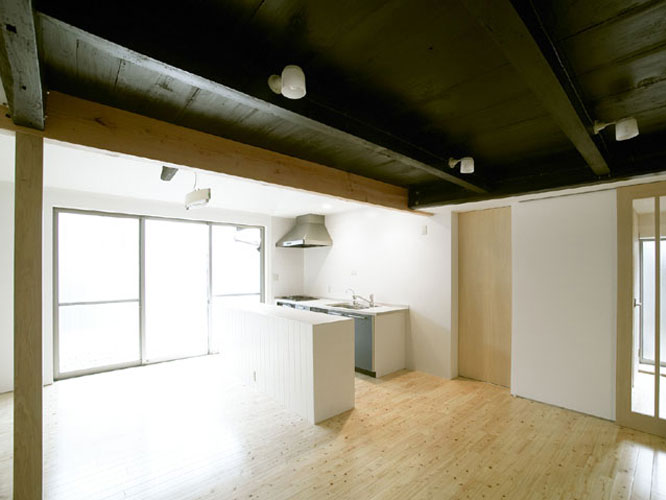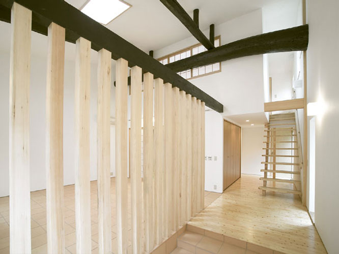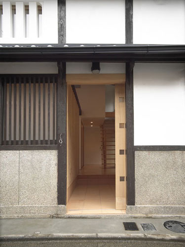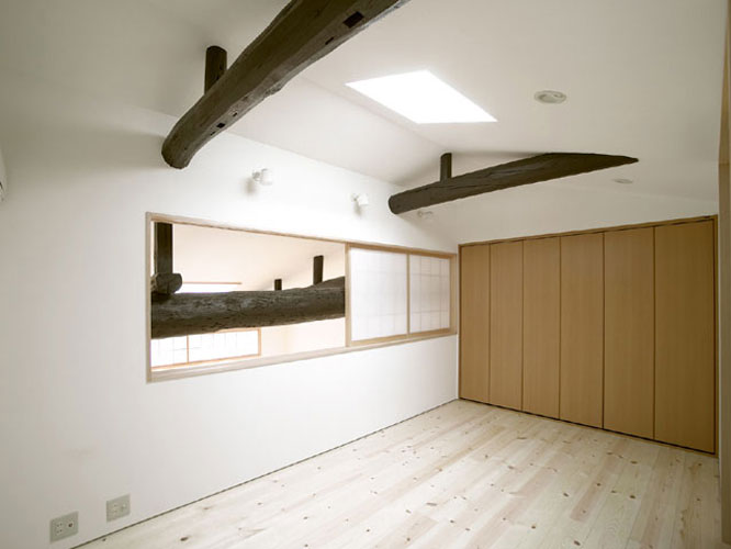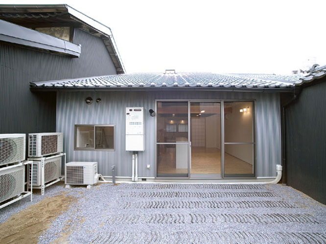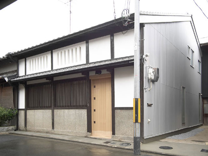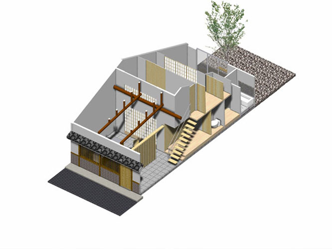 Back京都にある築約100年の町家のリフォーム。 「京都らしい街並みを継承し、歴史や趣のある構造素材や空間を利用すれば、新築には真似できない魅力ある住宅になりうる」として若夫婦の新居に再生した。コストバランスを考えながら現代生活に即した建築の機能回復と性能向上を計ると共に、京町家らしい外観を復元した。1階の天井は撤去し小屋組を表し、2階の空間にまで一体化させたシンプルな空間構成は、障子の開閉によりライフスタイルに合わせてフレキシブルな暮らしを楽しむことができる。