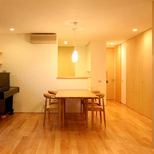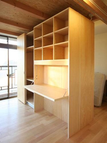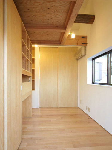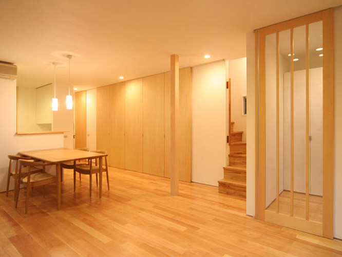 木造2階建ての住宅リフォーム。 基礎補強、壁補強といった建築的な基本性能の向上をした上で、1階にあった子供部屋を2階の和室へと置き換え、1階のリビングを拡張している。リビングはキッチン、階段と繋がりのある大きな空間とした。2階の子供部屋には天井高いっぱいの可動家具がそれぞれに用意され、互いの家具で部屋を区切ることで成長にも対応した使い方を提案している。稼動家具で区切られたスペースの上部にはロフトが設けた。